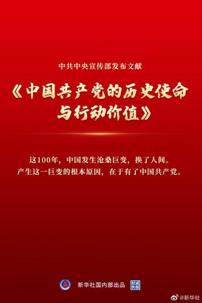文献指出,中国共产党是为中国人民谋幸福的政党,也是为人类进步事业奋斗的政党。无论国际风云如何变幻,中国共产党始终秉持和平、发展、公平、正义、民主、自由的全人类共同价值,始终弘扬国际主义精神,始终站在历史正确的一边,站在人类进步的一边,为世界和平发展作出贡献。 相关链接:中国共产党的历史使命与行动价值 |